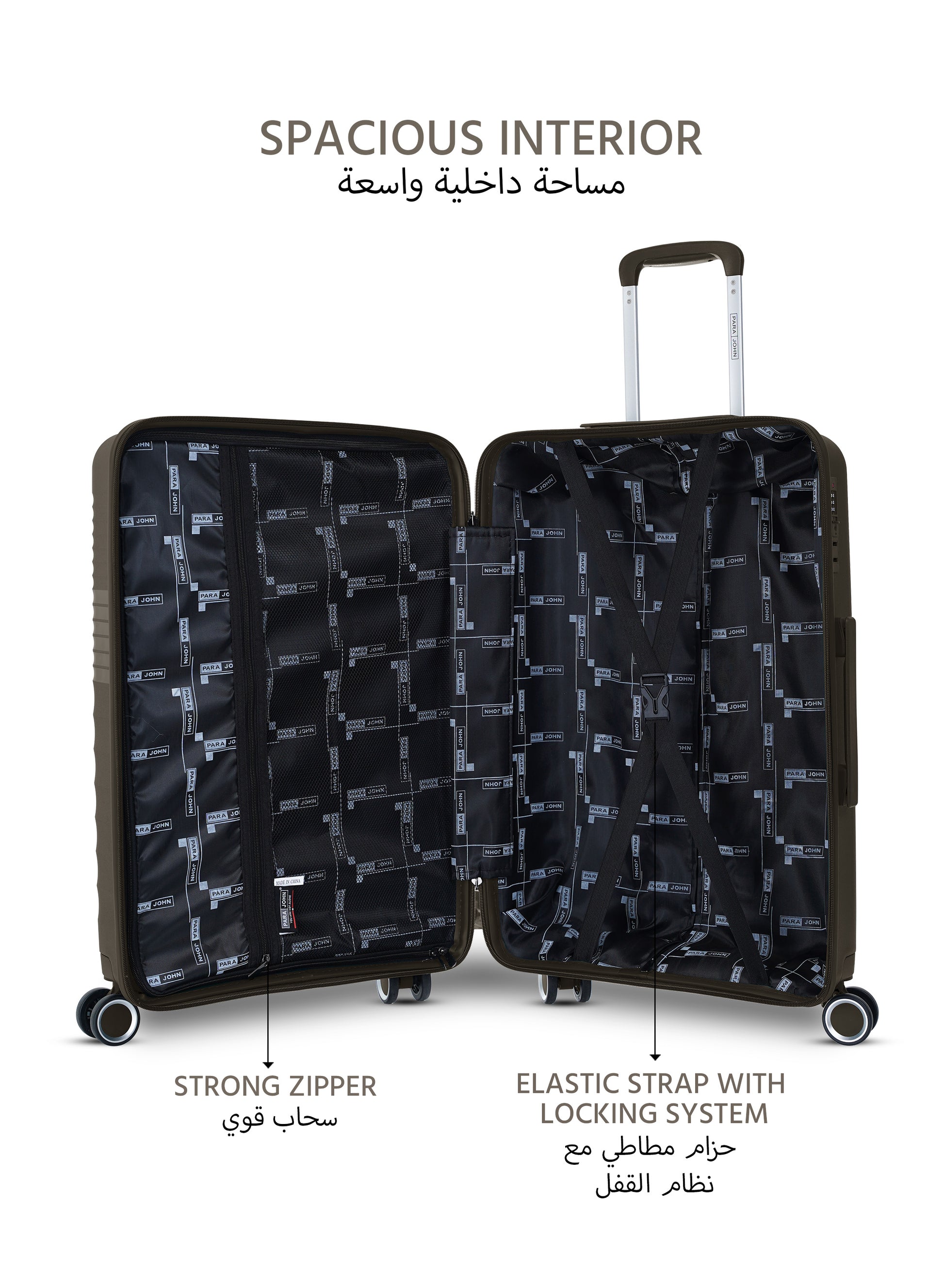 استمتع بالسفر المتميز معسلسلة الجاذبية لجونحقيبة مصنوعة من 100% من مادة البولي بروبيلين، توفر هذه الحقيبة متانة لا تقبل المنافسة ومقاومة للصدمات وسطحًا محكمًا مقاومًا للخدش يظل يبدو جديدًا. تنزلق بسهولة مع عجلات دوارة هادئة تتميز بـ TPE ناعمة وكرات تشحيم للدوران السلس 360 درجة. مقبض تلسكوبي خفيف الوزن من الألومنيوم ومقبض جانبي مريح يجعل الرفع والمناورة أمرًا سهلاً. بالداخل، يضمن الجزء الداخلي المصنوع من البوليستر 210D مع جيب شبكي وقسم بسحاب وحزام متقاطع تعبئة فعالة. تم تصنيع هذه الحقيبة بفخر بواسطة PARA JOHN، وهي شركة حاصلة على شهادة ISO 9001:2015 وSGS، وتجمع هذه الحقيبة بين الجودة الممتازة والموثوقية. بالإضافة إلى ذلك، مع ضمان لمدة عامين، يمكنك السفر براحة بال تامة.