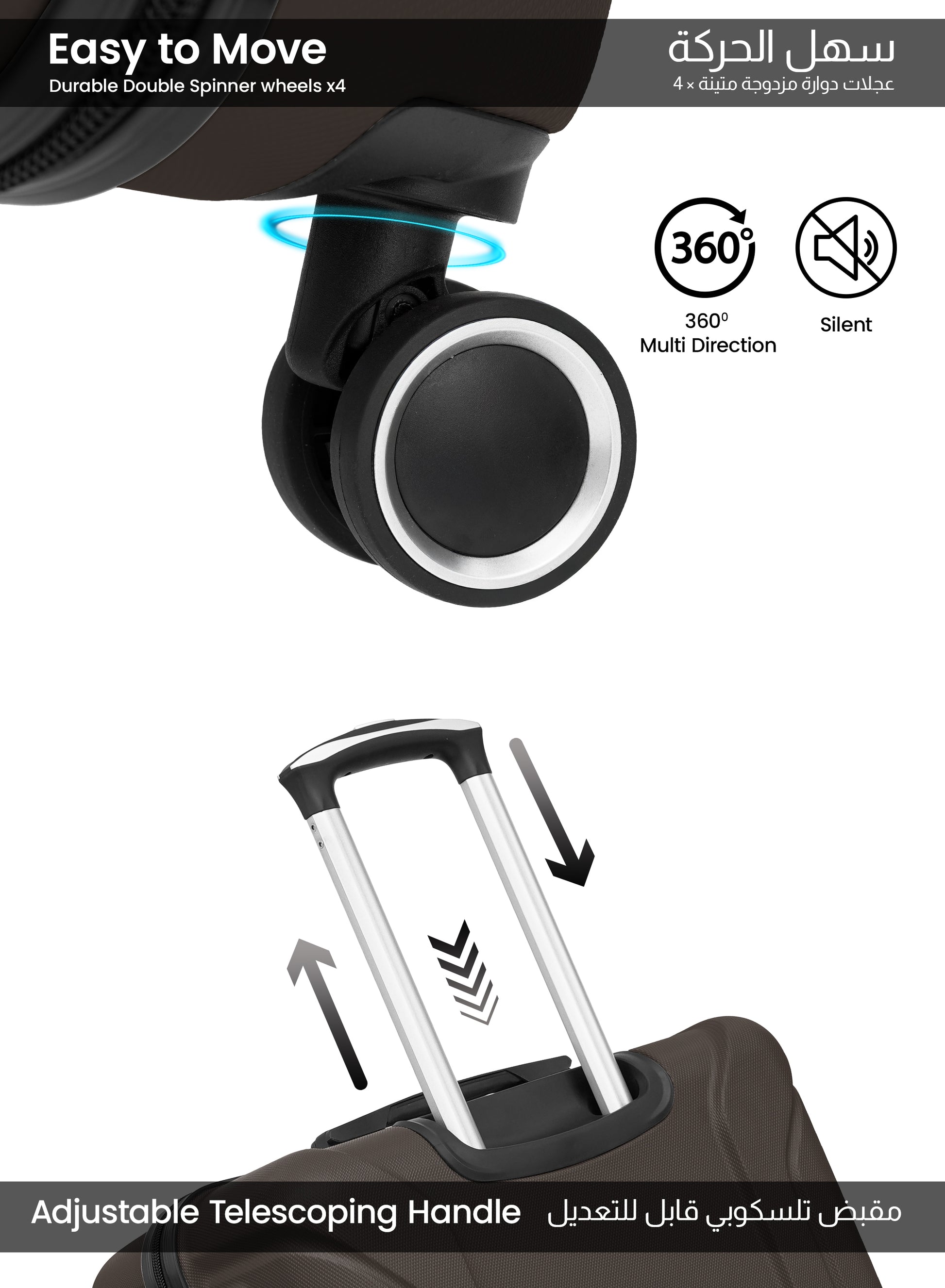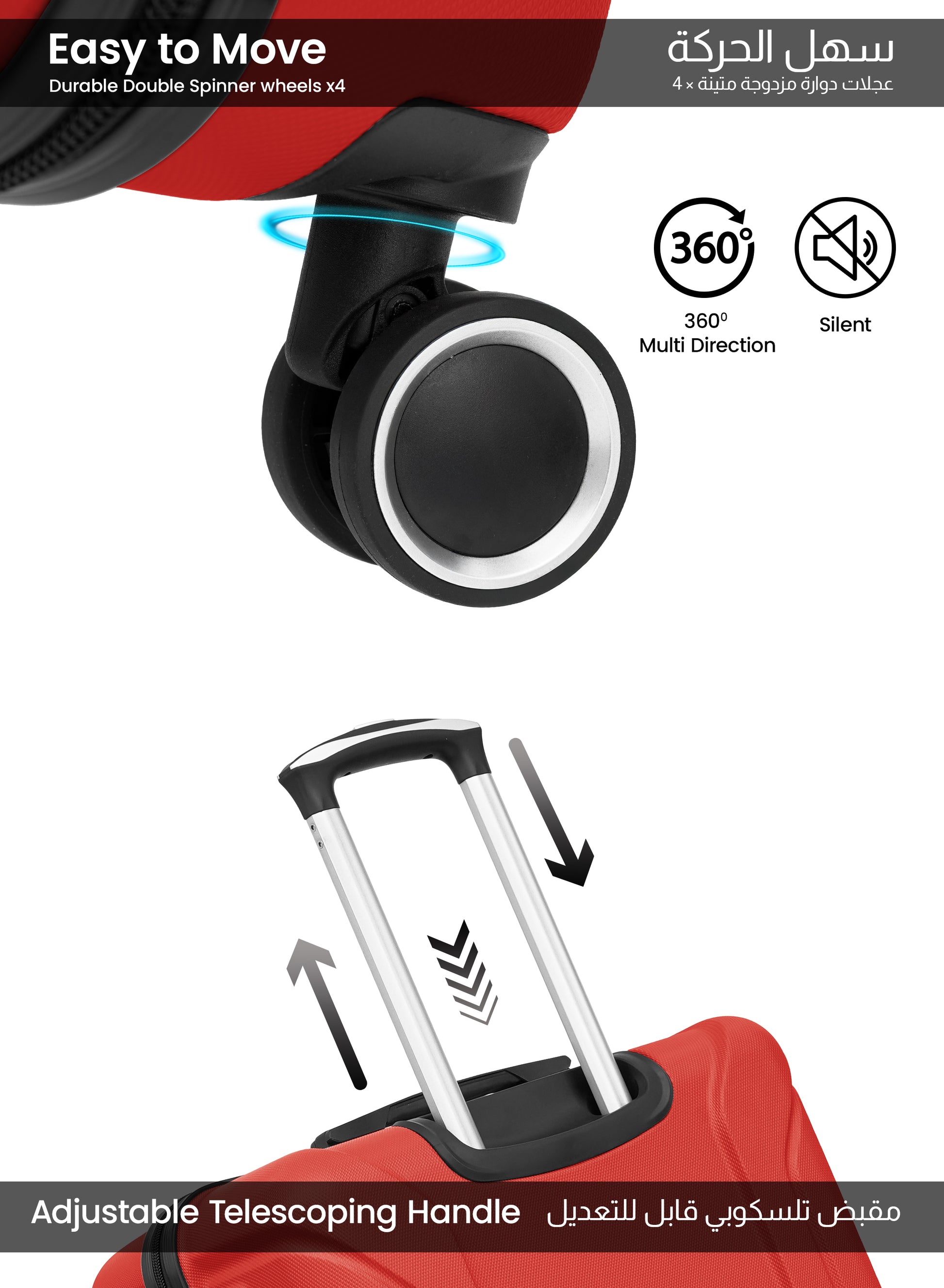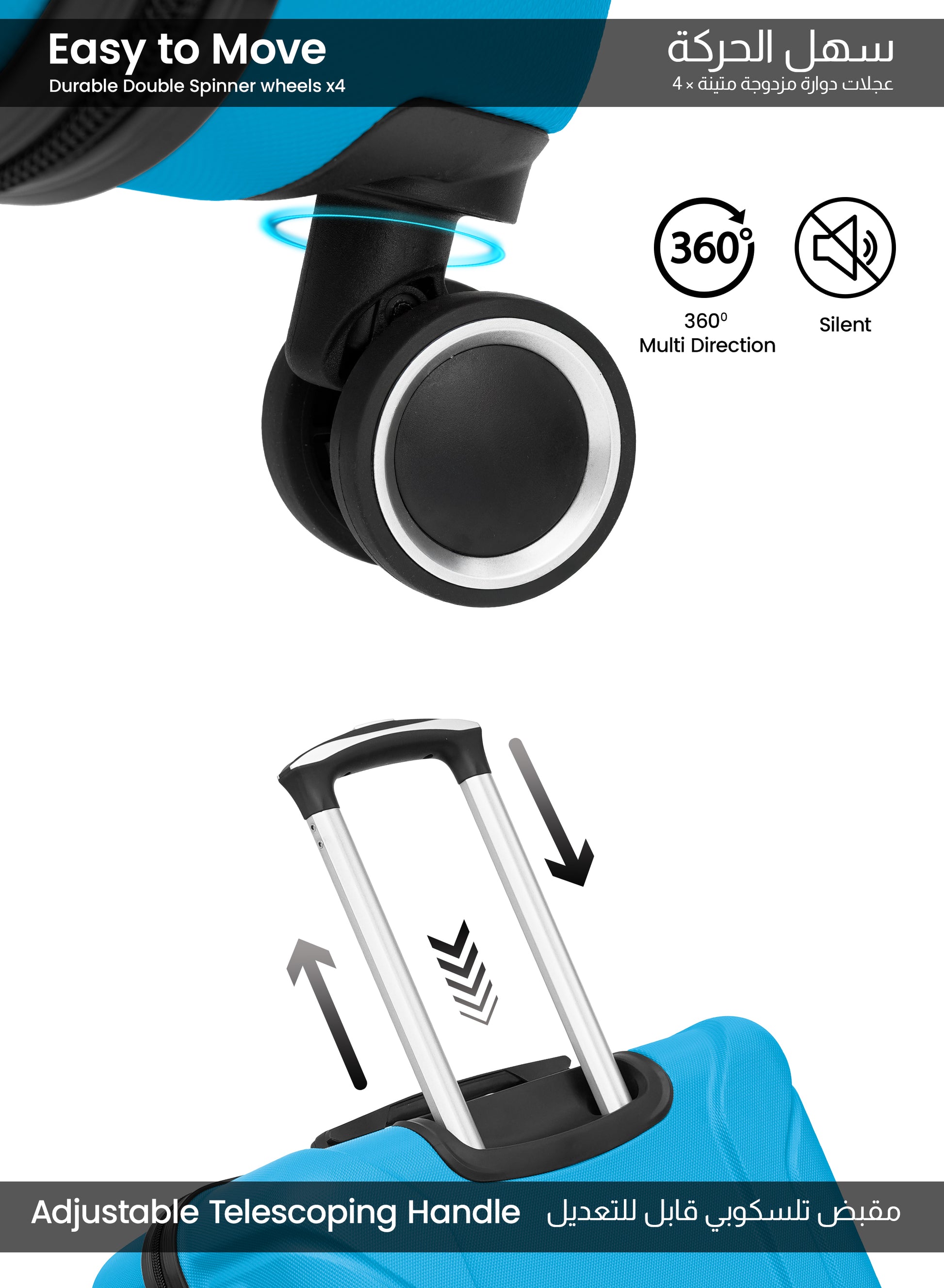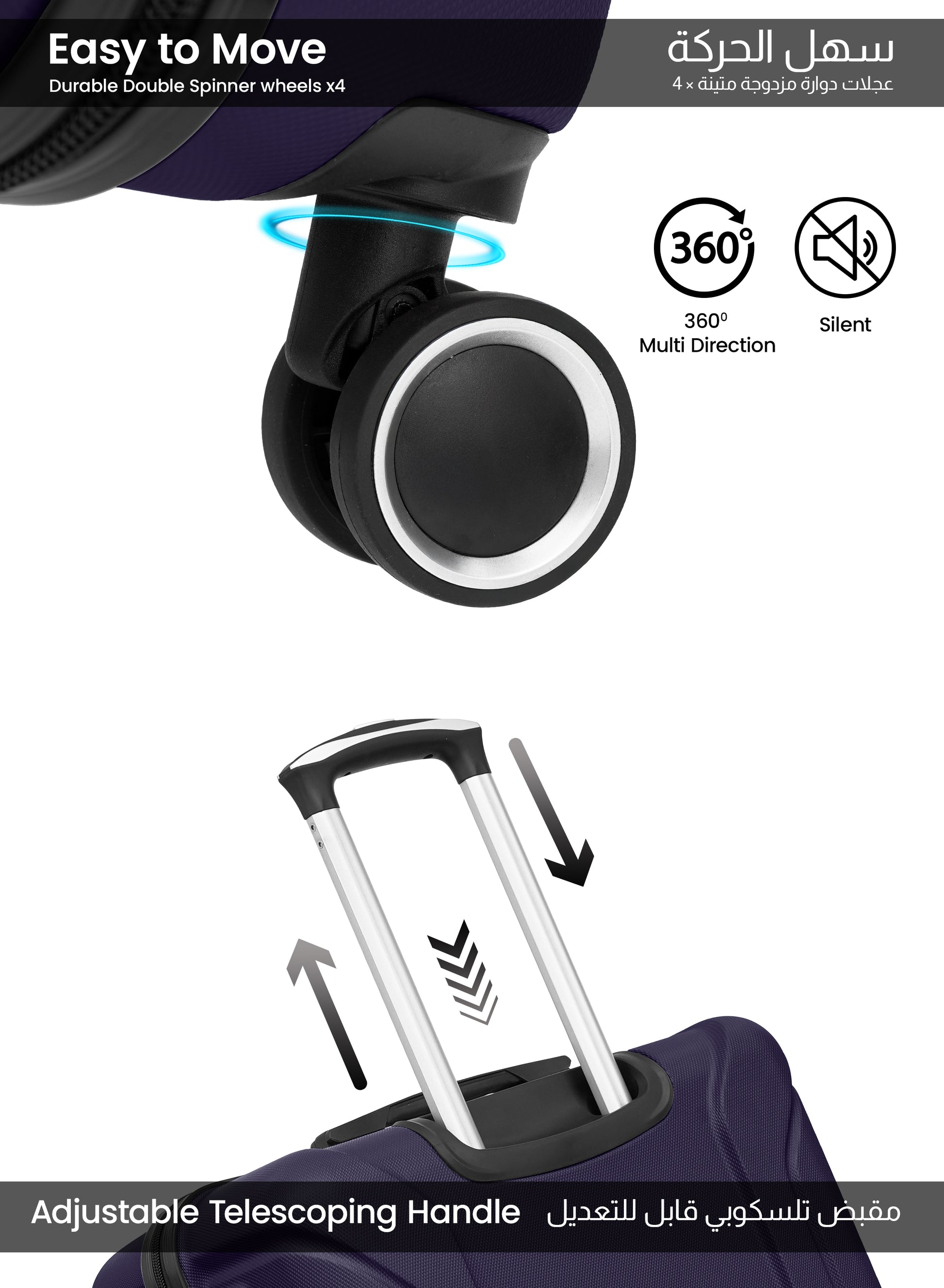 - 360° spinner wheels for smooth maneuverability in any direction.