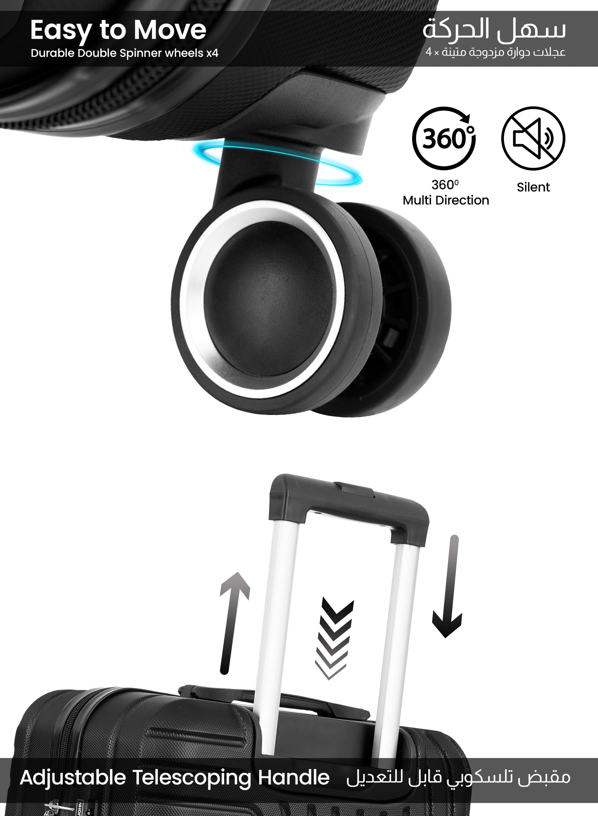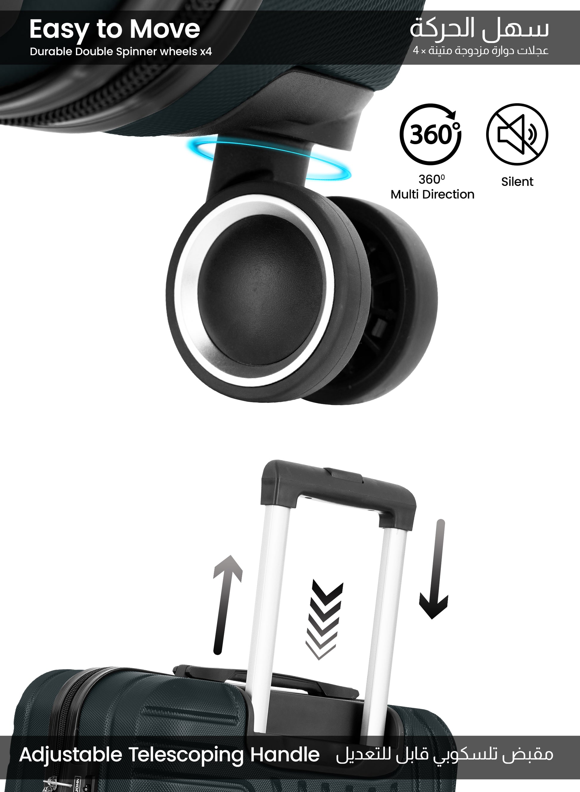 - 360° spinner wheels for smooth maneuverability in any direction.