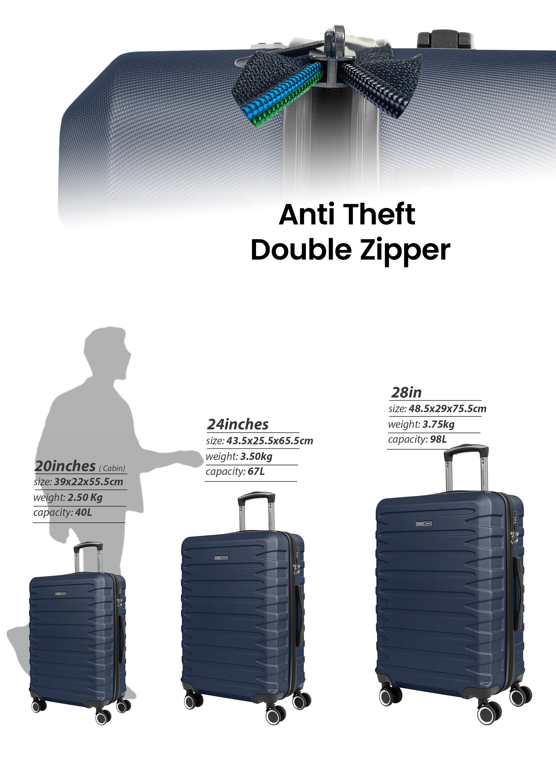 Built to brave the journey — this premium ABS luggage set merges form and function in a sleek, wave-patterned armor. The tough horizontal-line design isn't just style-forward; it’s engineered to distribute impact and reduce stress points during rough handling. Glide smoothly through airports with silent 360° spinner wheels, while a fortified red-button combination lock amps up your security game. With expandable zippers for those last-minute extras and shock-absorbing inner panels, your belongings are protected inside and out. Designed with a fail-proof telescopic handle and backed by a 2-year warranty, this set means serious business in travel durability.