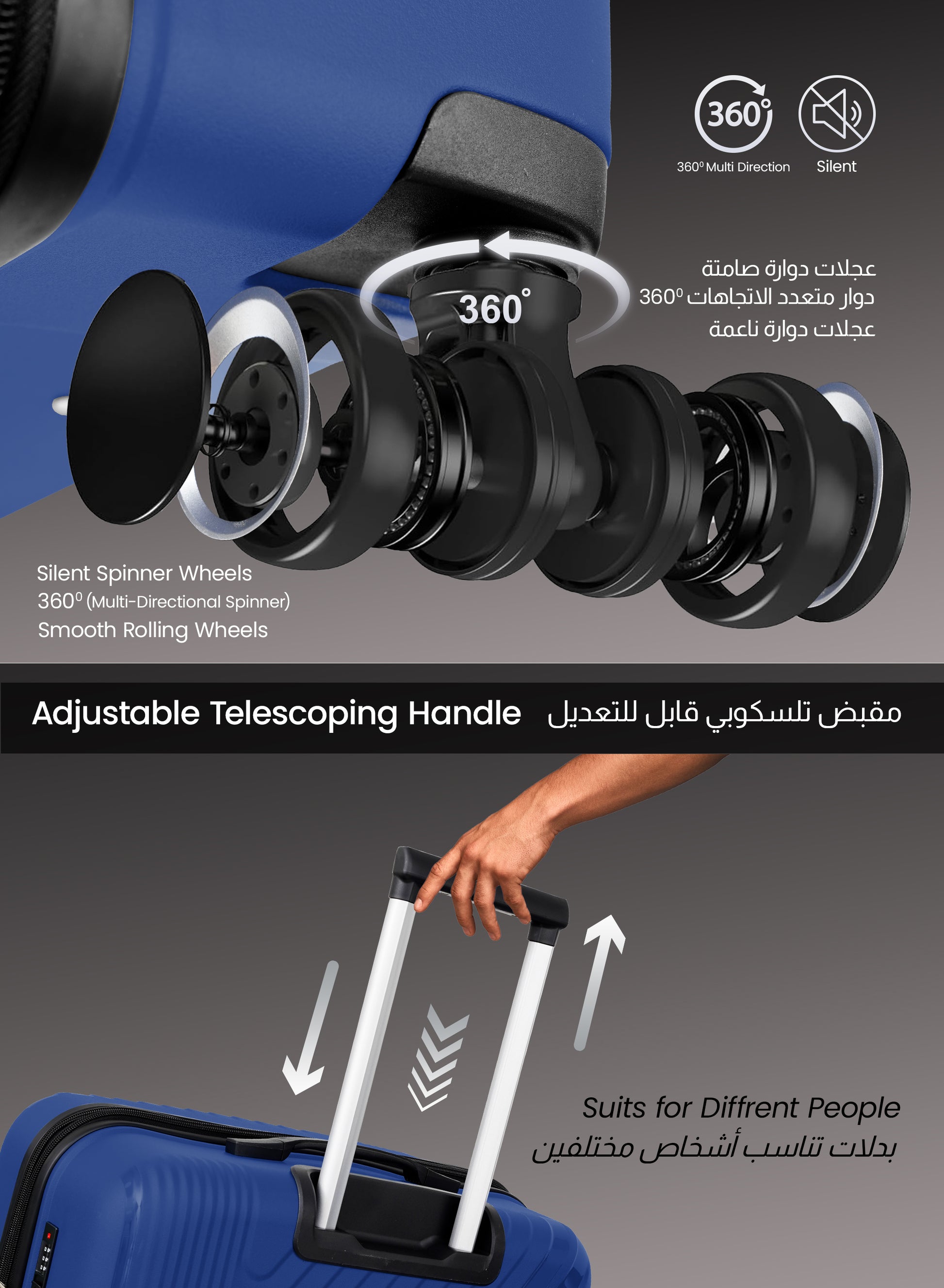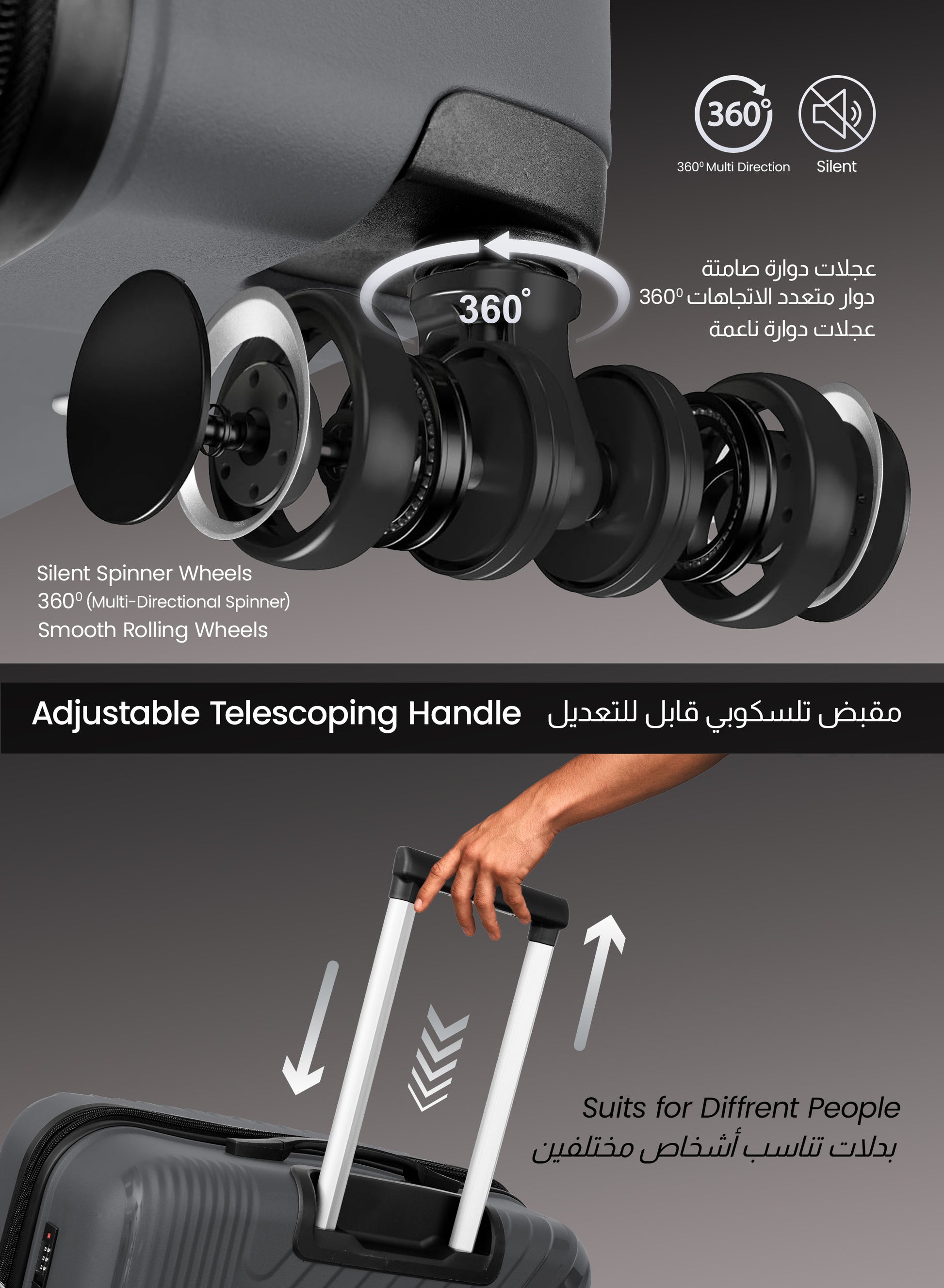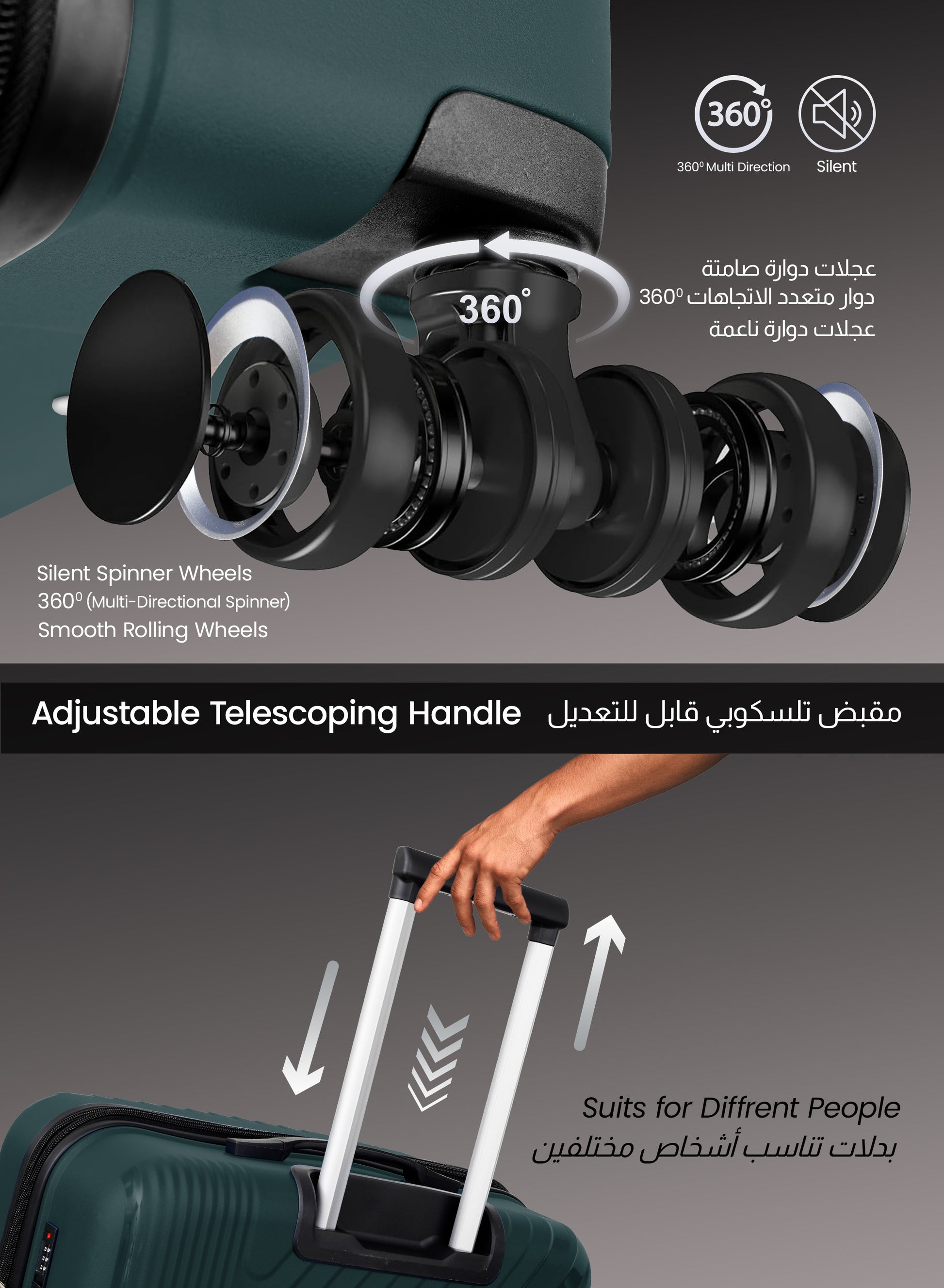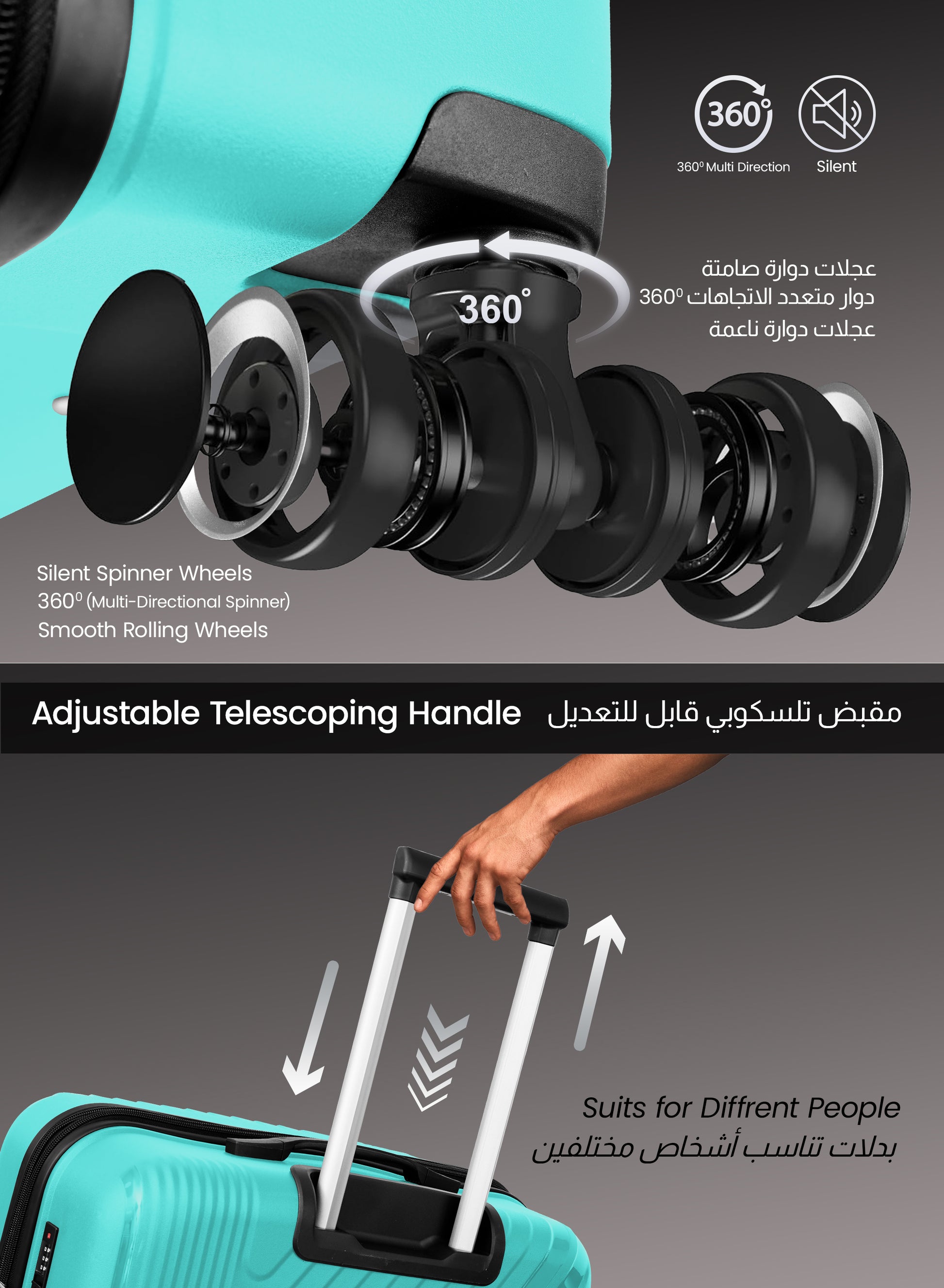 - 8 Wheels 360° silent spinners for effortless mobility over any direction