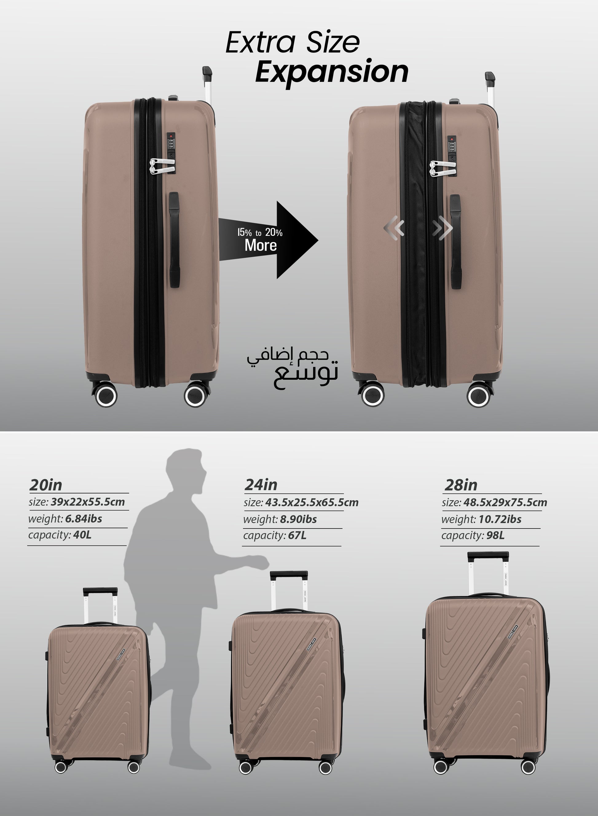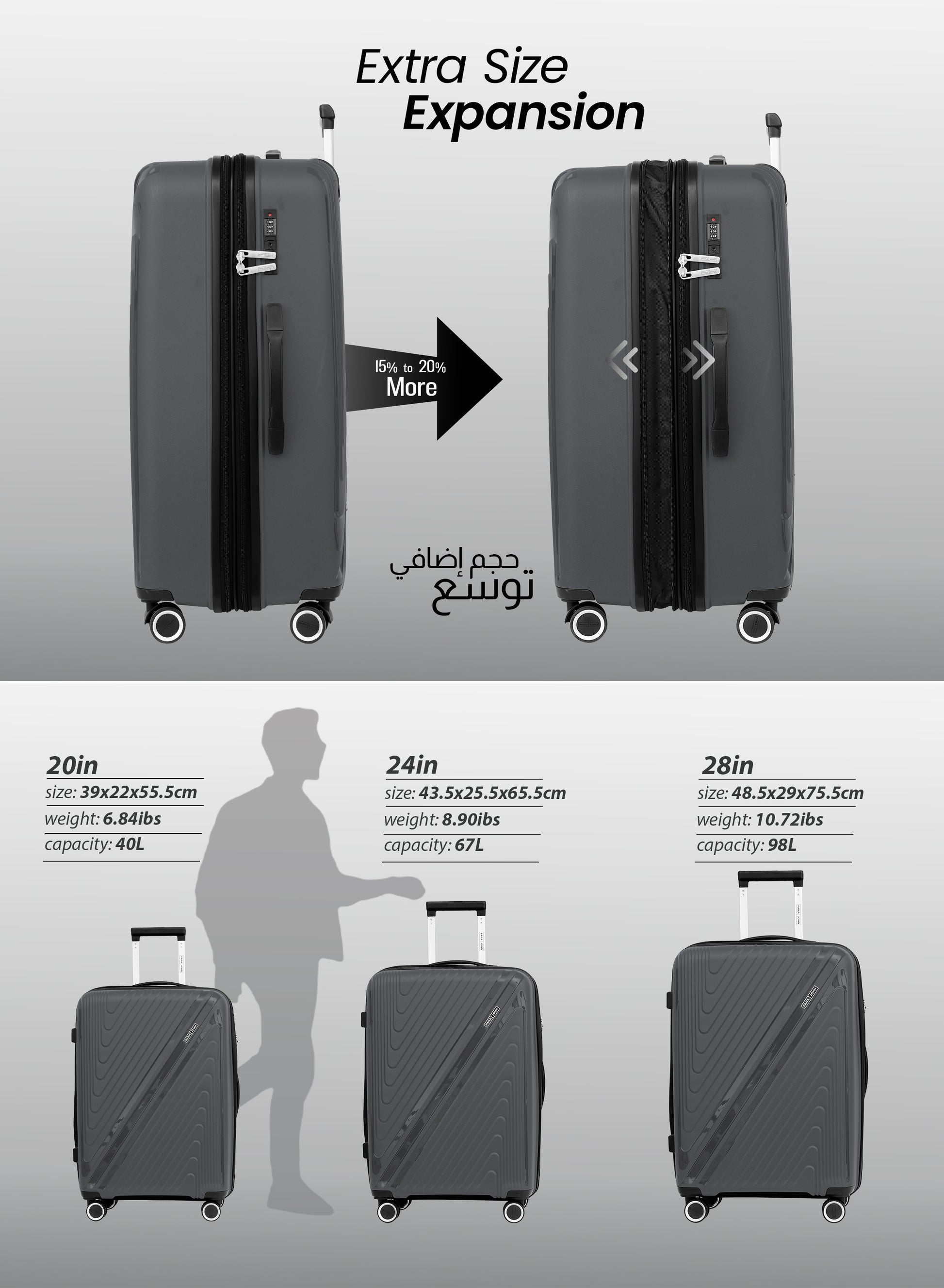 - Durable Exterior Polypropylene (PP) shell with expandable Zipper.